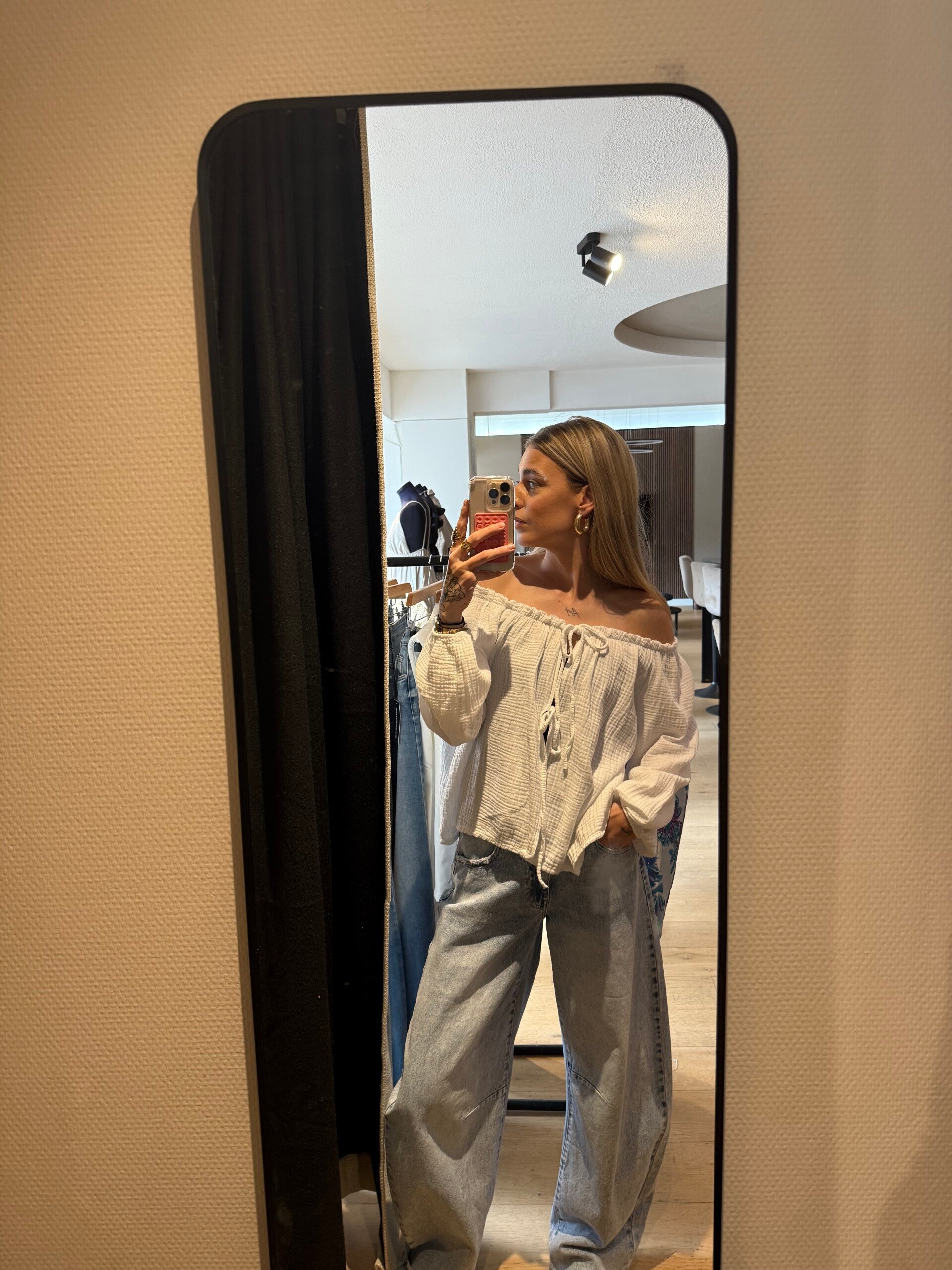 De Nora Off Shoulder Top is jouw ultieme zomertopper. Gemaakt van 100% ademend katoen, voelt deze blouse heerlijk luchtig en comfortabel aan op warme dagen. De off-shoulder halslijn geeft een vrouwelijke touch, terwijl de losse fit zorgt voor een nonchalante, effortless look.